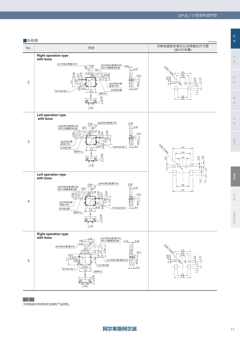 产品编号 照片 电路数 接点数 端子形状 动作力 扳手的长度 操作方向 电路 定位销 框脚 尺寸(W×D×H)