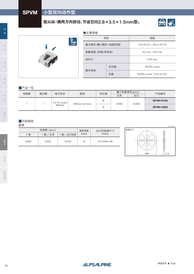 立式 / 小型双向动作型 ・ 最大额定值:1mA 5V DC ・ 动作力:0.4N max. ・ 操作寿命(无负载):50000 cycles。