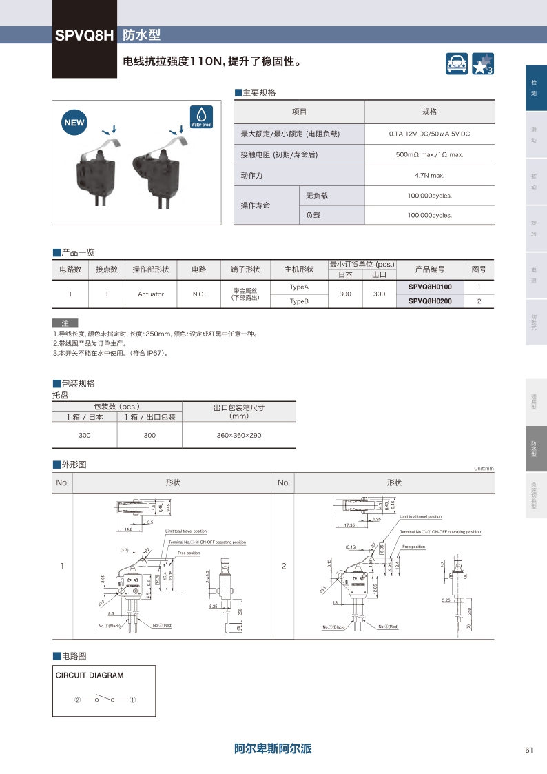 防水型 ・ 最大额定值:0.1A 12V DC ・ 动作力:4.7N max. ・ 操作寿命(无负载):100000cycles ・ 防水及防尘型:IP67。