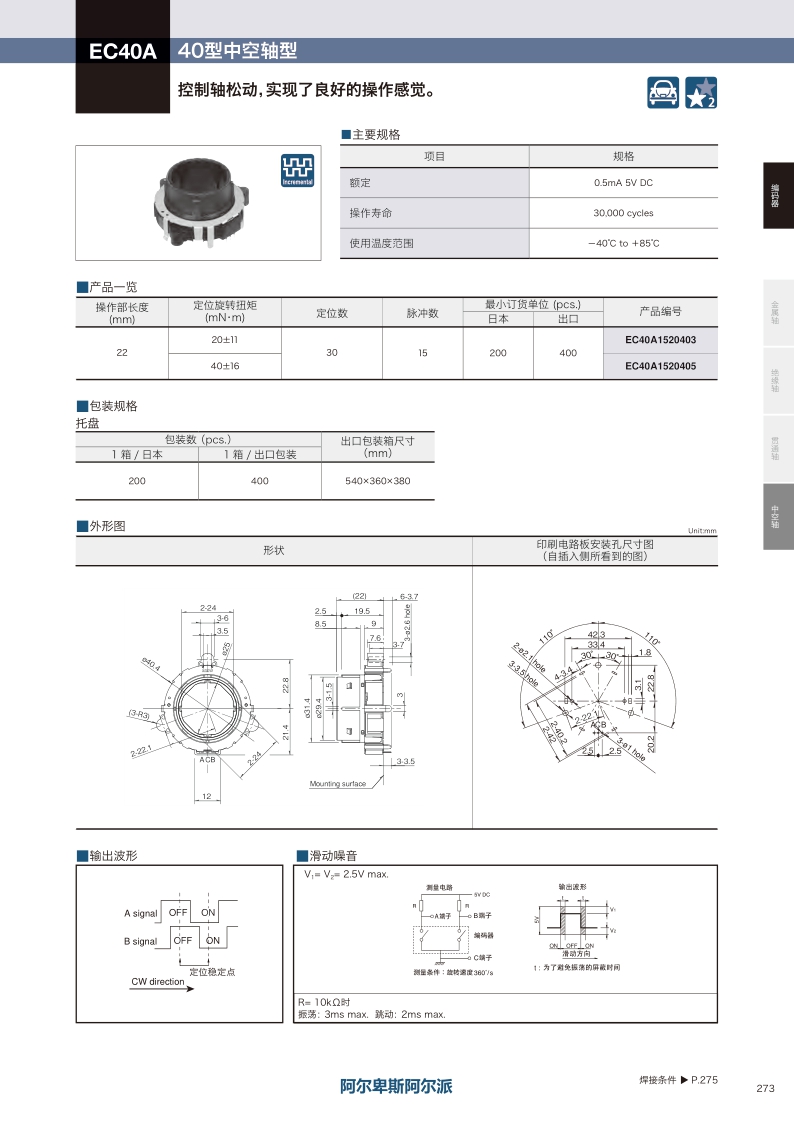 EC40A系列控制轴松动,实现了良好的操作感觉。输出:增量(A B 2相输出) ・ 外形尺寸:40mm size ・ 定位数:30 ・ 脉冲数(位置数):15 ・ 操作寿命:30000 cycles ・ 最大额定值:0.5mA 5V DC。