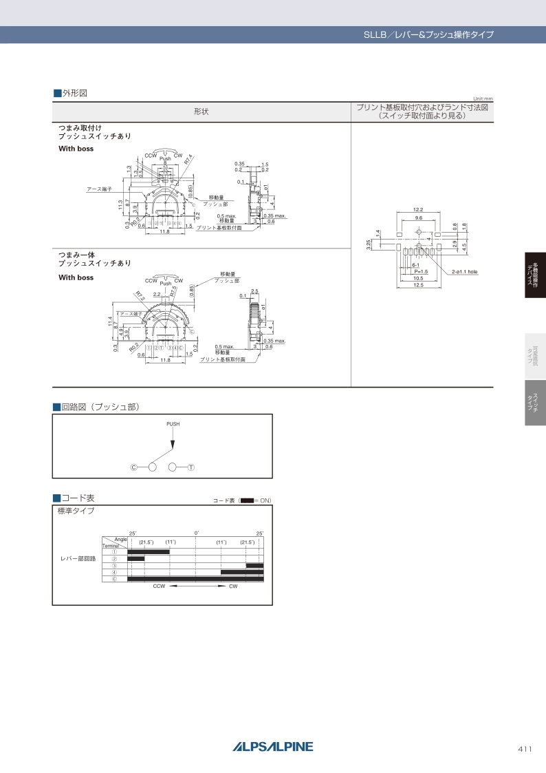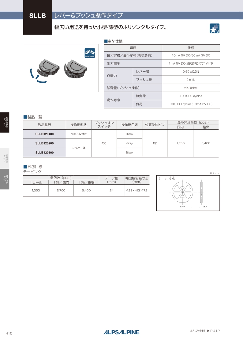 SLLB系列使用范围广泛的小型 薄型横向操作开关。方向分辨率:2方向 ・ 功能:操作杆和按动 ・ 尺寸(W×D×H):11.8×11.4×3.0mm ・ 最大额定值:10mA 5V DC。