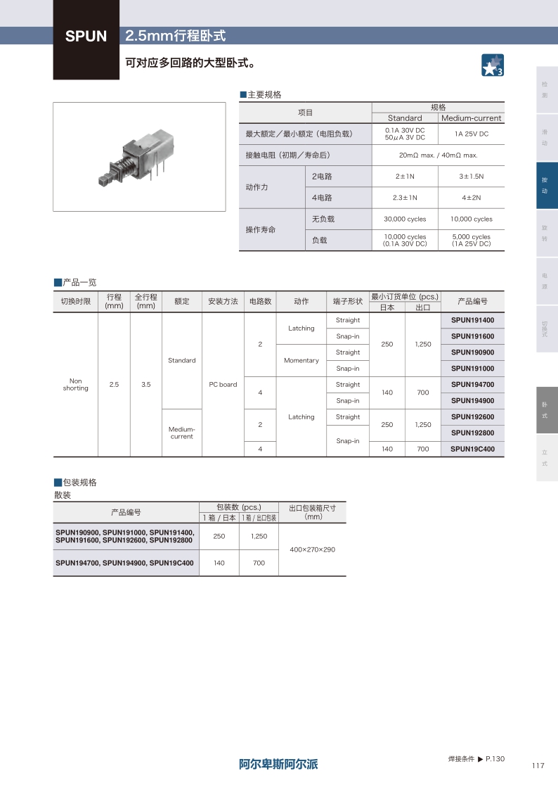 可对应多回路的大型卧式。操作方向:Horizontal ・ 最大额定值:0.1A 30V DC (Standard) 1A 25V DC (Midium-current) ・ 行程:2.5mm ・ 电路数:2/4-pole。