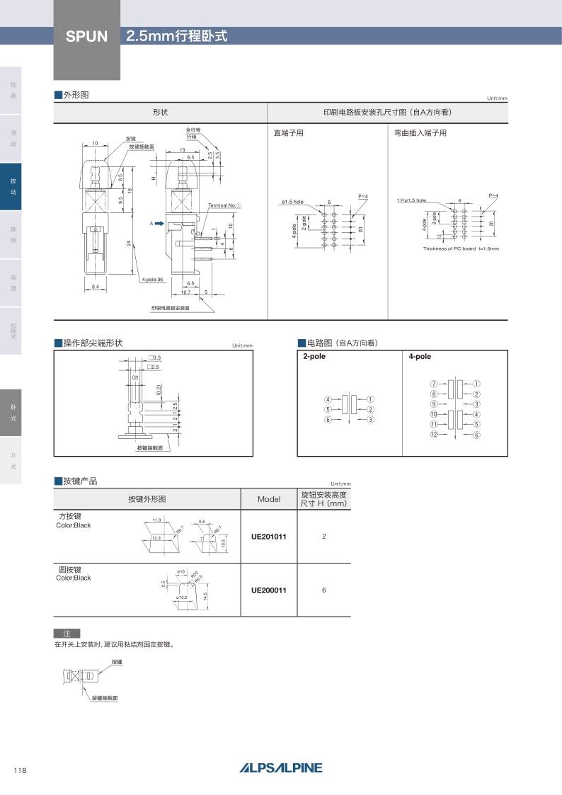 SPUN191000 照片 Non shorting 2.5mm 3.5mm Standard 2±1N PC board 2 Momentary Snap-in 24.0×10.0×13.0mm