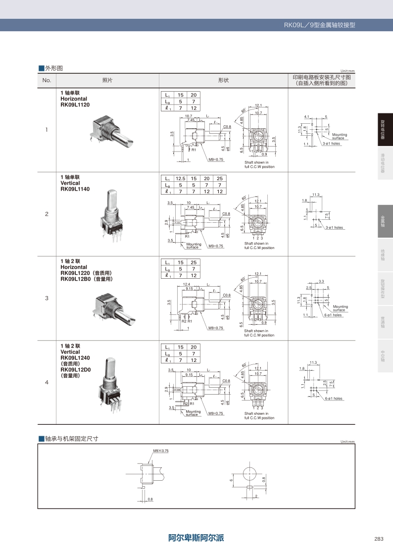 RK09L系列适合各种控制用的单联,2连联。型:金属轴铰接 ・ 外形尺寸:9型 ・ 电阻体数:单联,2联 ・ 附属开关:无。