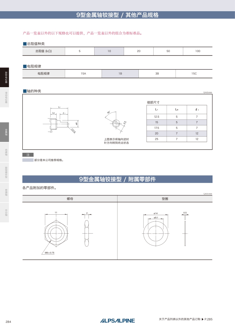产品编号 照片 操作轴数 电阻体数 操作部方向 軸受固定方法 操作部形状 操作部长度 定位 总阻值 电阻规律 尺寸