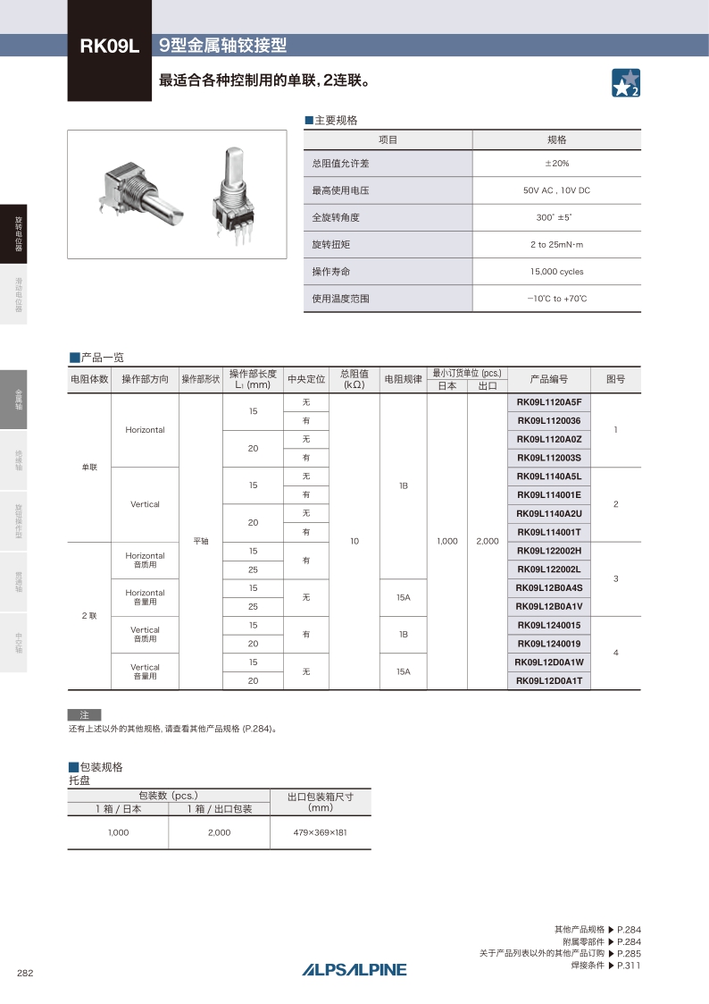 RK09L1120036 照片 1轴 单联 Horizontal 螺纹固定 平轴 15mm 中央定位 10kΩ 1B 9型
