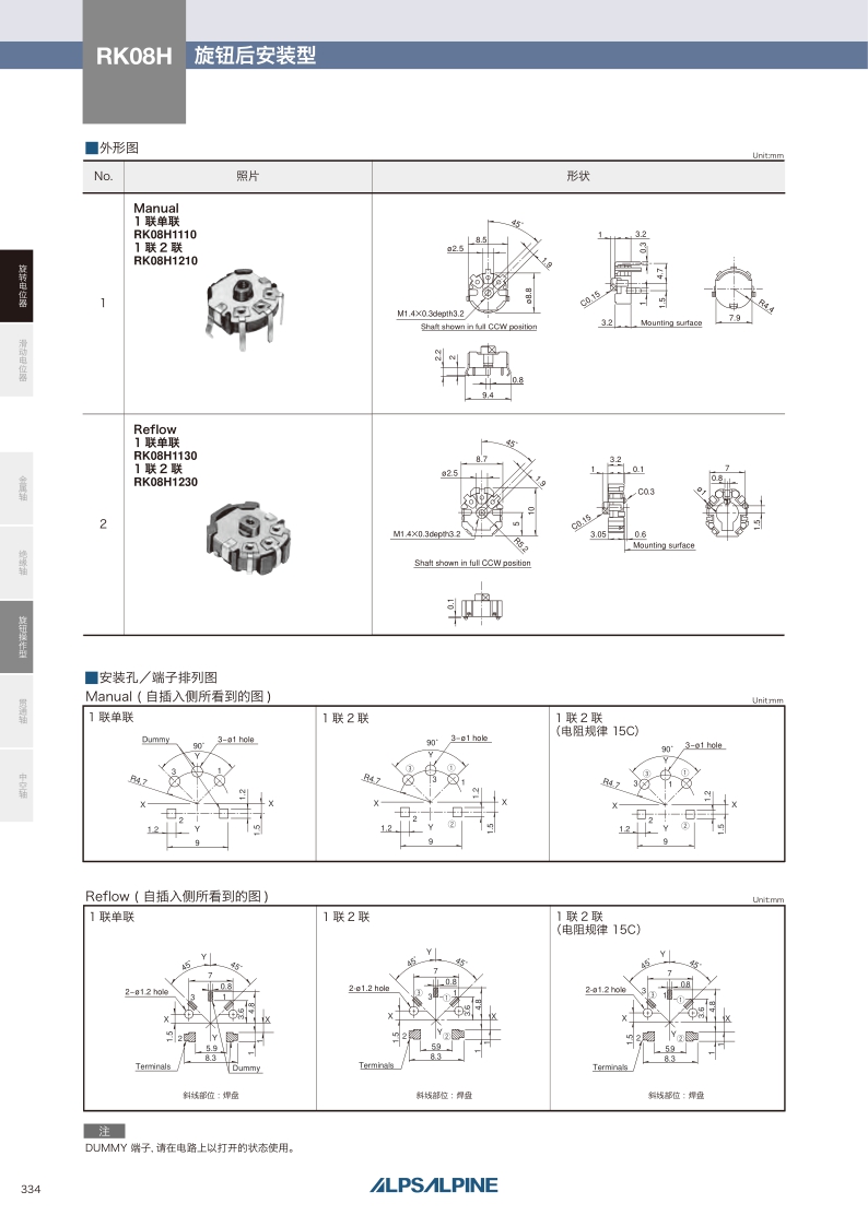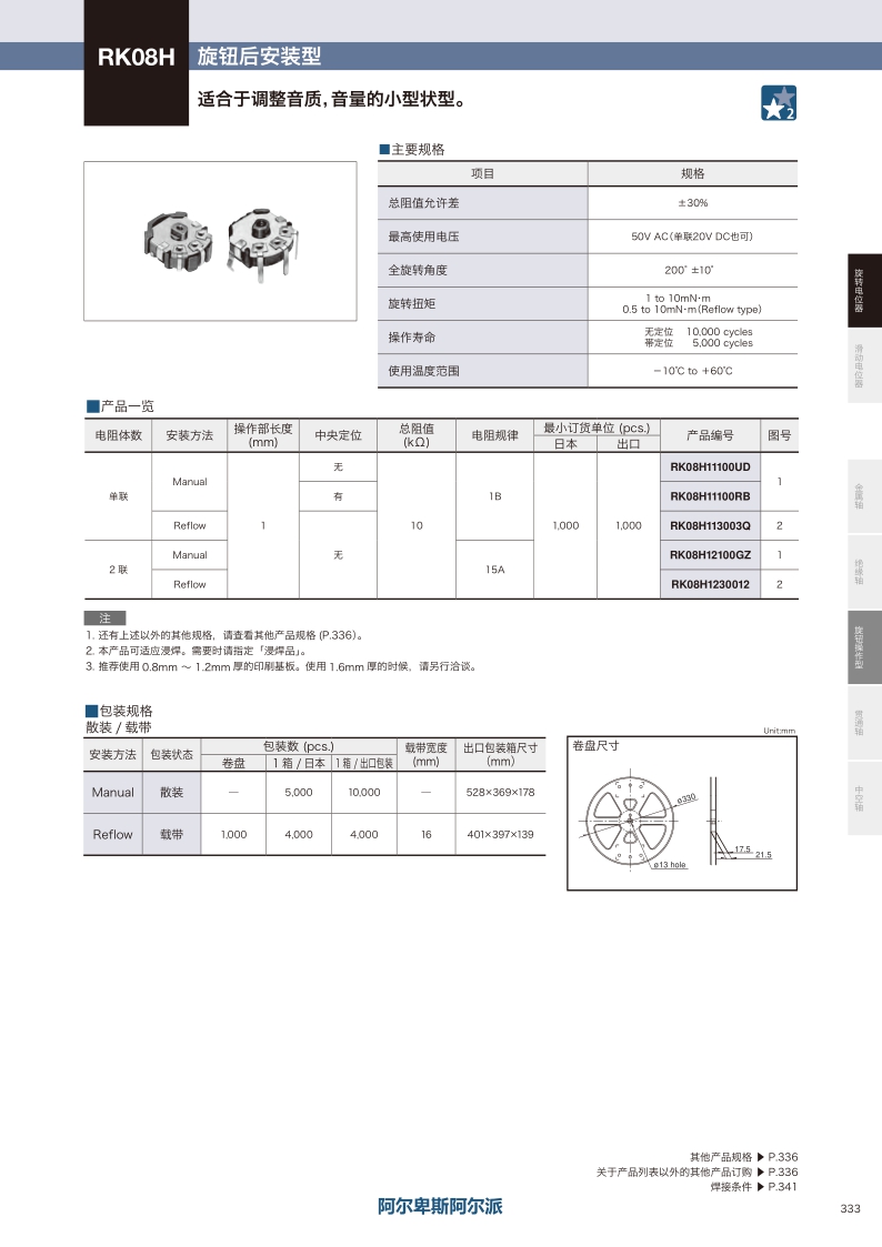 RK08H系列适合于调整音质,音量的小型状型。型:旋钮后安装 ・ 外形尺寸:8型 ・ 电阻体数:单联,2联 ・ 附属开关:无。
