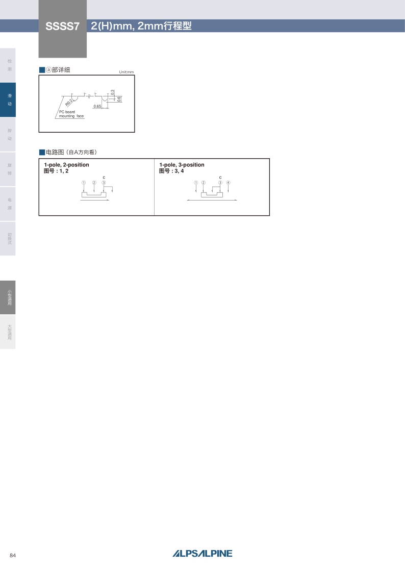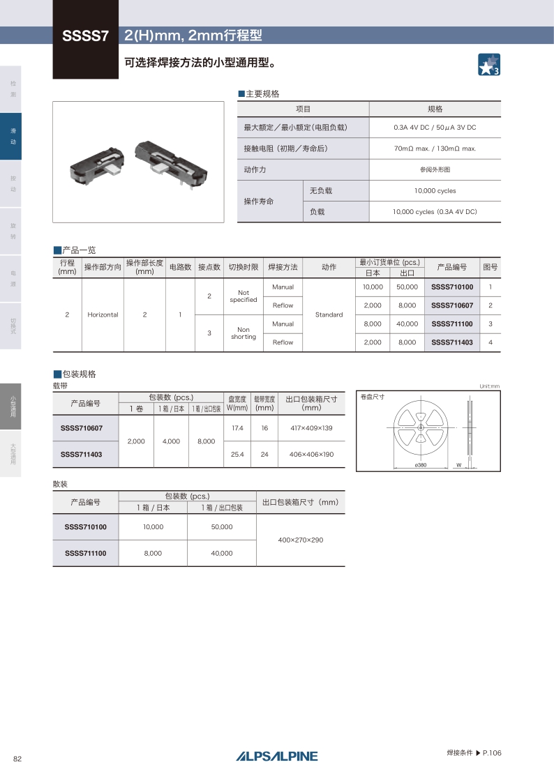 可选择焊接方法的小型通用型。操作方向:Horizontal ・ 安装高度:2.0mm ・ 行程:2.0mm ・ 最大额定值:0.3A 4V DC ・ 电路数:1-pole。
