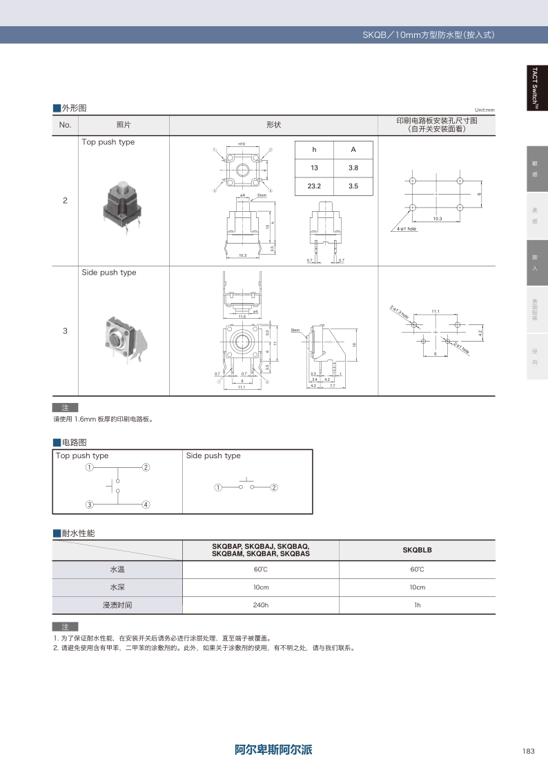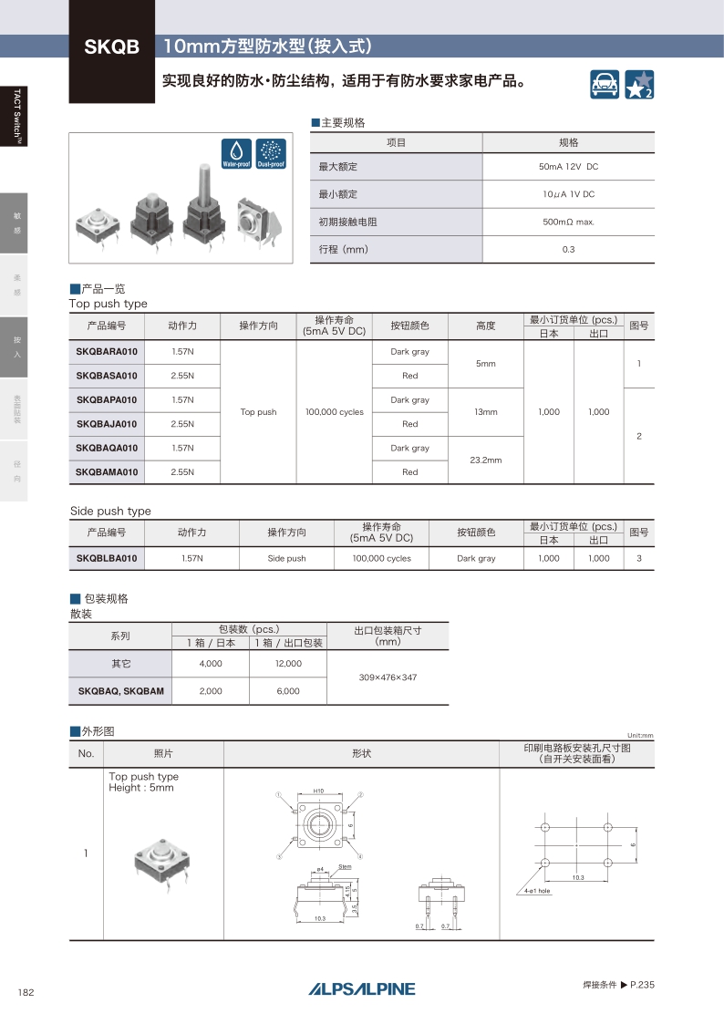 实现良好的防水·防尘结构 适用于有防水要求家电产品。操作感觉:敏感 ・ 贴装方式:按入 ・ 尺寸(W×D×H):Top push: □10.0×5.0/13.0/23.2mm Side push: 11.5×11.9×11.3mm ・ 特长:防水及防尘型。