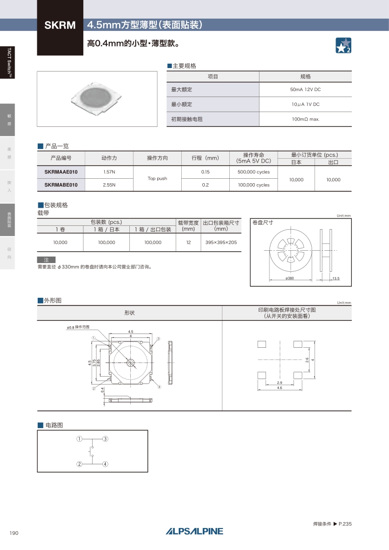 SKRMABE010 照片 Surface mount 2.55N Top push 0.2mm 0.4mm 100,000 cycles 100mΩ max. 4.5×4.5×0.4