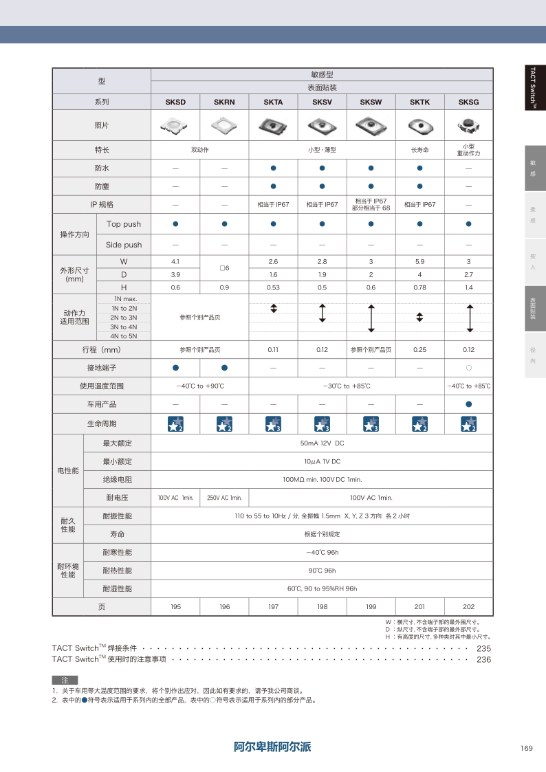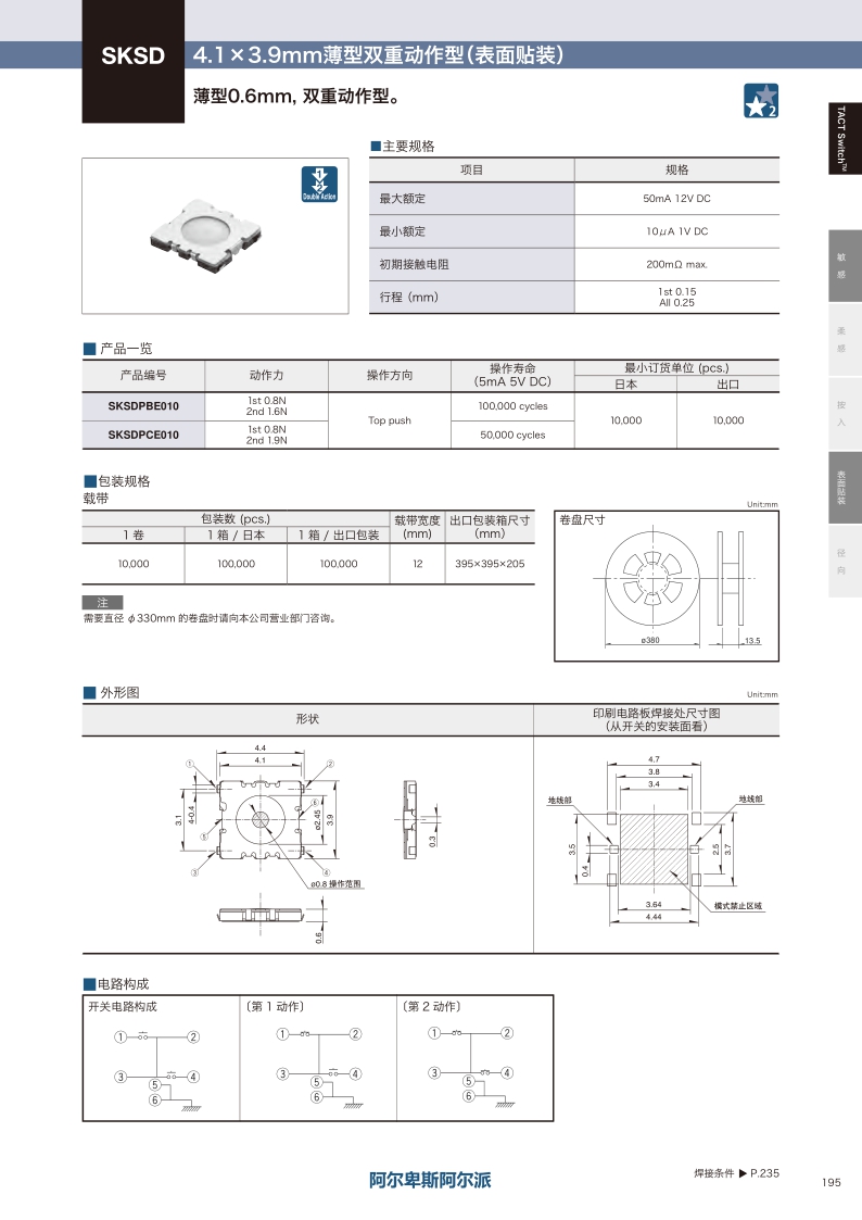 SKSDPBE010 照片 Surface mount 1st 0.8N, 2nd 1.6N Top push 1st 0.15mm, All 0.25mm 0.6mm 100,000 cycles 200mΩ max. 4.1×3.9×0.6