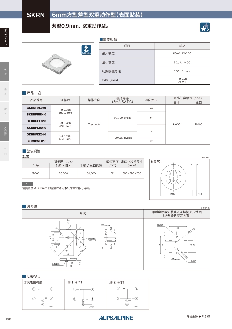 SKRNPBE010 照片 Surface mount 1st 0.78N, 2nd 2.45N Top push 1st 0.25mm, All 0.4mm 0.9mm 30,000 cycles 100mΩ max. 6.0×6.0×0.9