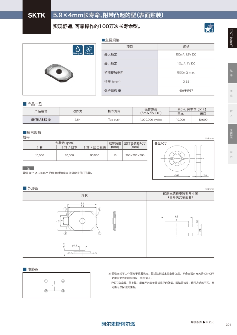 5.9×4.0mm 长寿命、附带凸起的型(表面贴装) SKTK系列型号:SKTKABE010