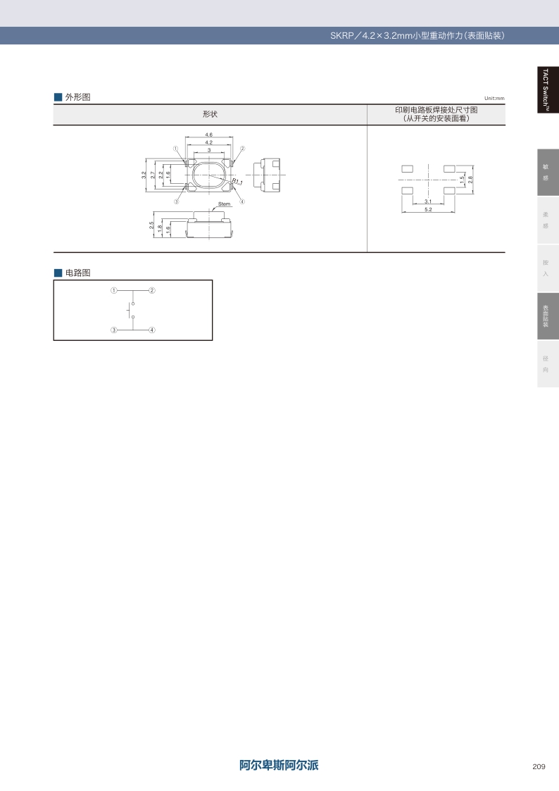 适合于汽车用需要的重动作力 按钮面积大贴装性能优良。操作感觉:敏感 ・ 贴装方式:表面贴装 ・ 尺寸(W×D×H):4.2×3.2×2.5mm ・ 特长:小型・重动作力。