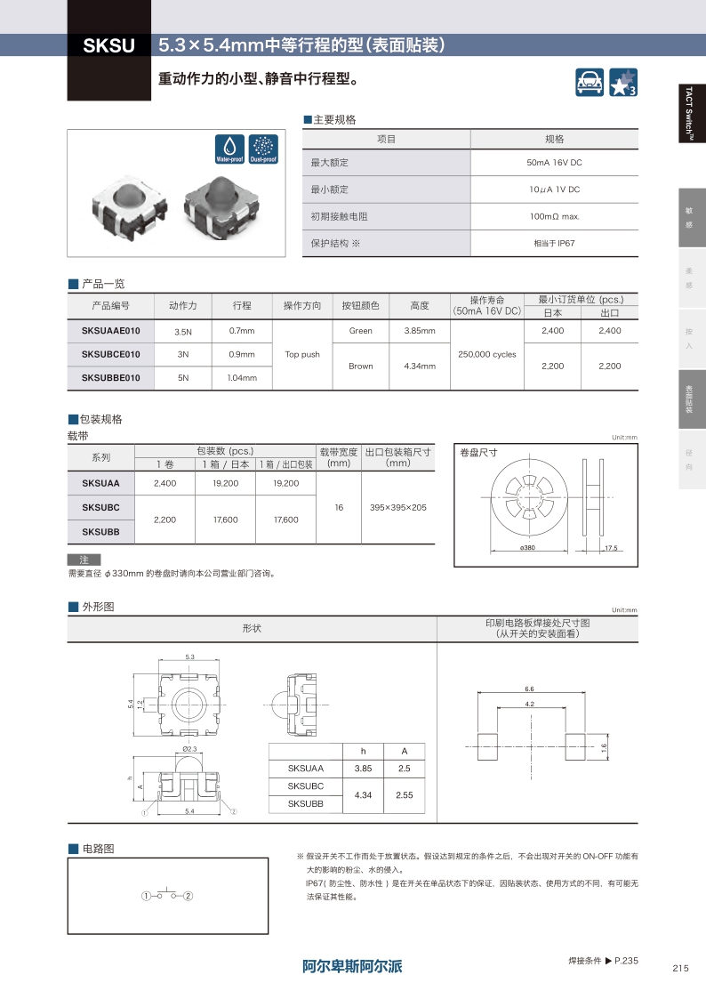 兼顾了较重作动手感与静音的小型化中行程类型。操作感觉:敏感 ・ 贴装方式:表面贴装 ・ 尺寸(W×D×H):5.3×5.4×3.85/4.34mm ・ 特长:中行程 防水及防尘型 IP67。