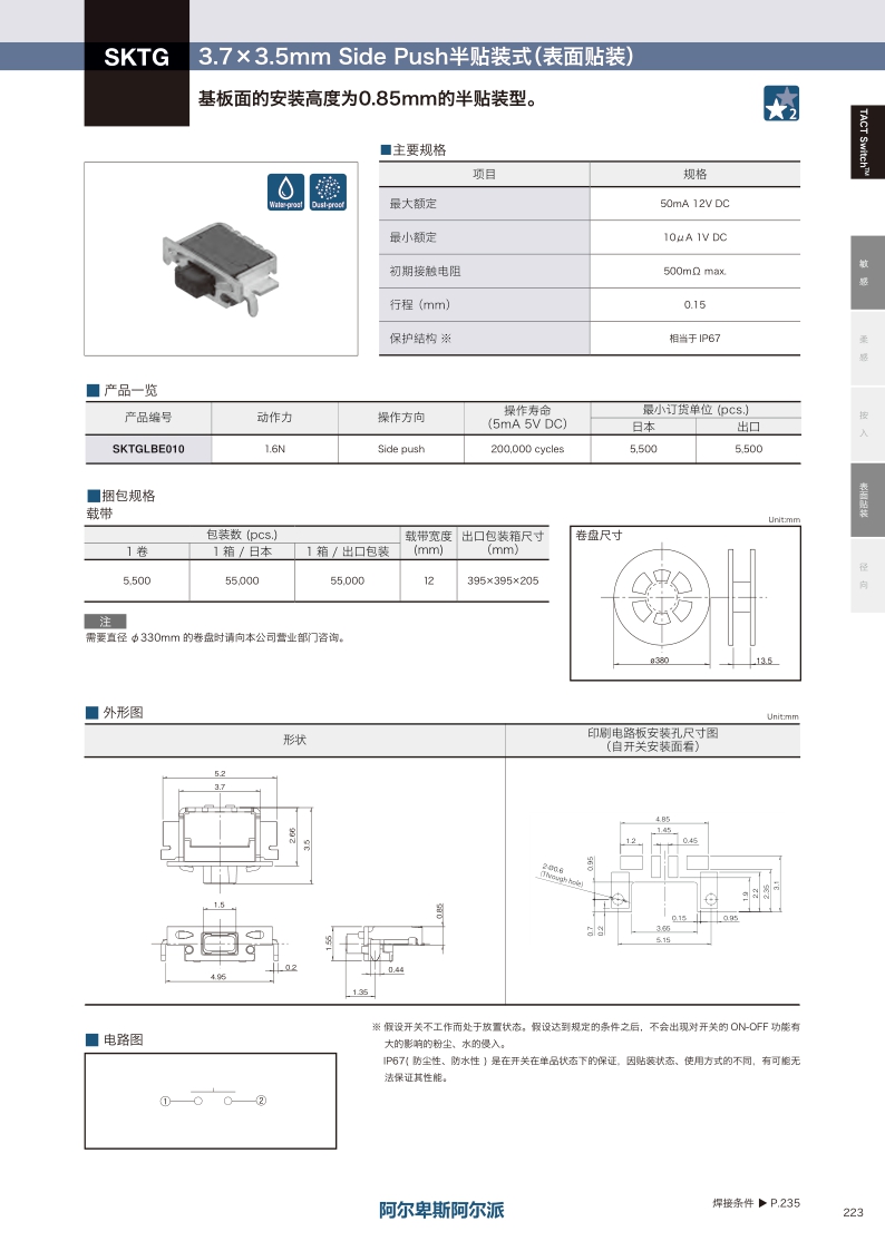 3.7×3.5mm Side Push半贴装式(表面贴装) SKTG系列型号 :SKTGLBE010