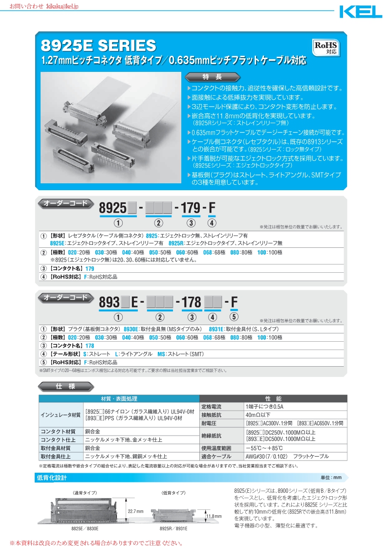 8925E系列是1.27mm间距的底板对线连接器。兼容AWG#30扁平电缆。实现了嵌合高度为 11.8mm低剖面薄型化。(8925R:适用于没有溢放口的产品)