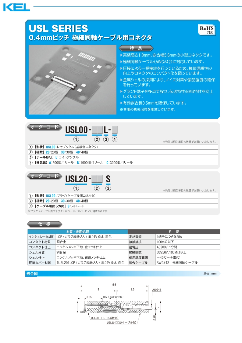 KEL线对板连接器,USL系列极细同轴电缆。“USL系列”是用于微同轴电缆(AWG#42)的0.4 mm间距绝缘位移连接器,USL系列超细同轴电缆用0.4mm间距IDC连接器,线对板连接器插座,直角,极数有20、30、40,包装数量有500、1000、5000。主要用于照相机、摄像机、DV机、无人机等图像传输、数据传输等。